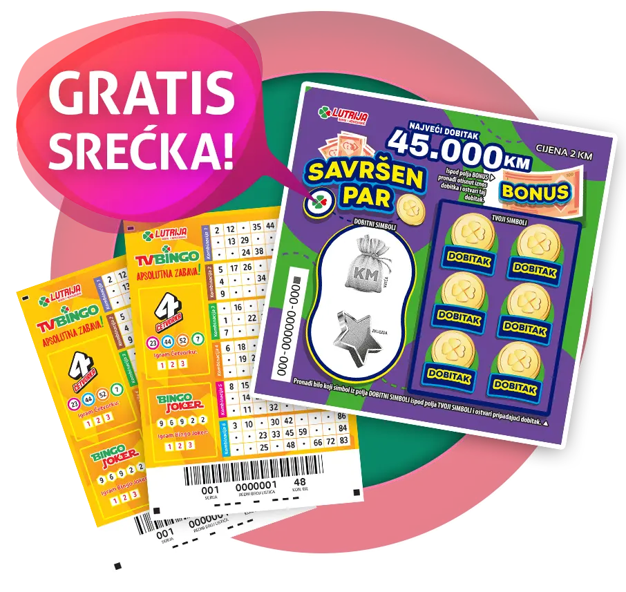 Igrači koji u prodajnoj mreži Lutrije BiH odigraju DVA žuta TV Bingo listića sa jednim Jokerom i jednom Četvorkom na poklon će dobiti srećku SAVRŠEN PAR.